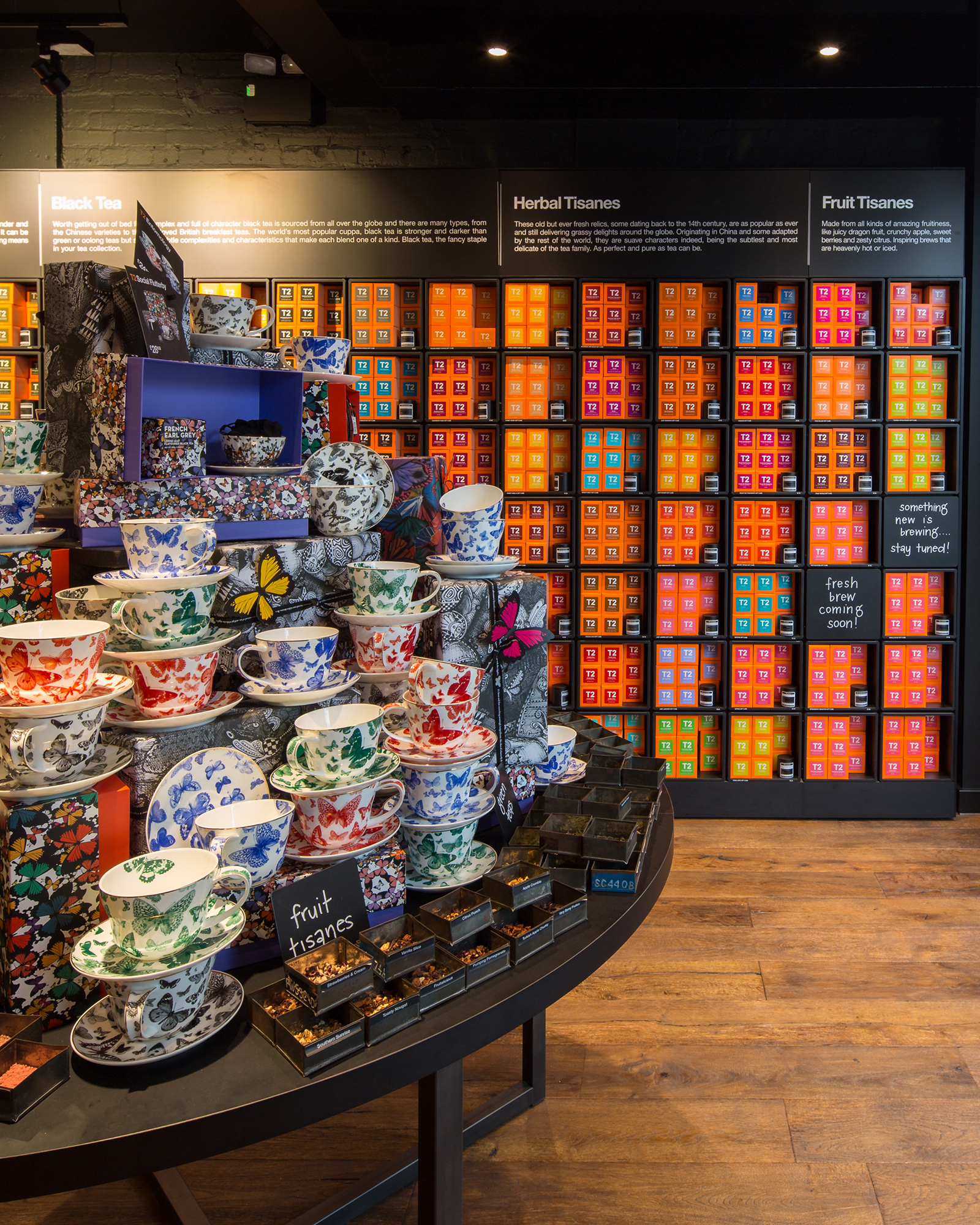 Klient chtěl přiřadit k jednotlivým druhům čaje specifický nábytek. Některé čaje byly určeny k míchání, jiné pouze k vystavení. Na základě tohoto rozdělení byl vytvořen seznam, jak by se měl nábytek jmenovat a k jakému účelu bude sloužit. Designer připravil návrh, který klient schválil. Obchody, většinou o velikosti kolem 100 m², měly za cíl vytvořit na zákazníky silný první dojem.